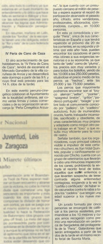 Piden 700.000 pesetas por un perro en la Feria de Arzúa Deixar un comentario / Prensa / Cans De caza Piden 700.000 pesetas por un perro en la Feria de Arzúa Ler máis »